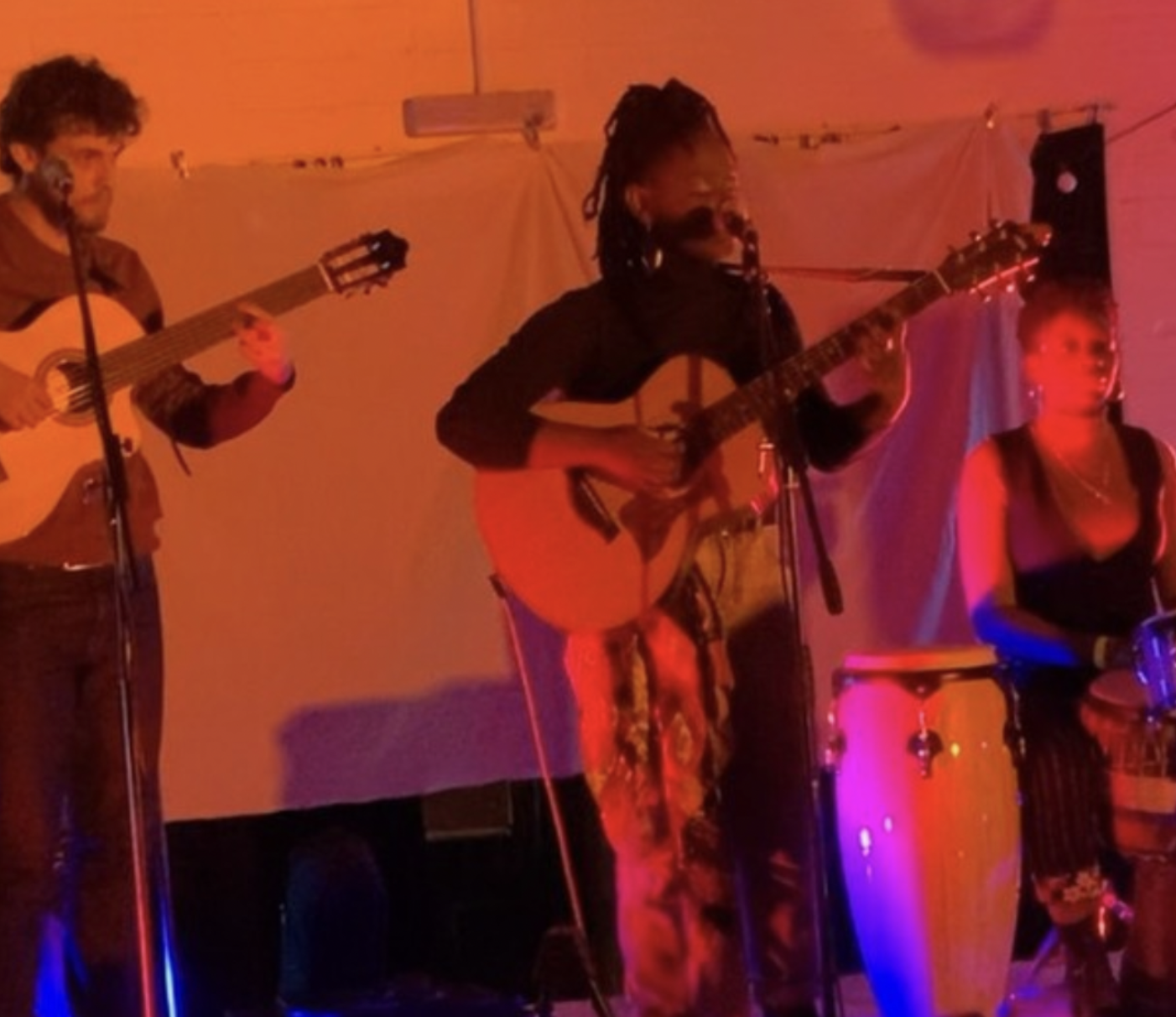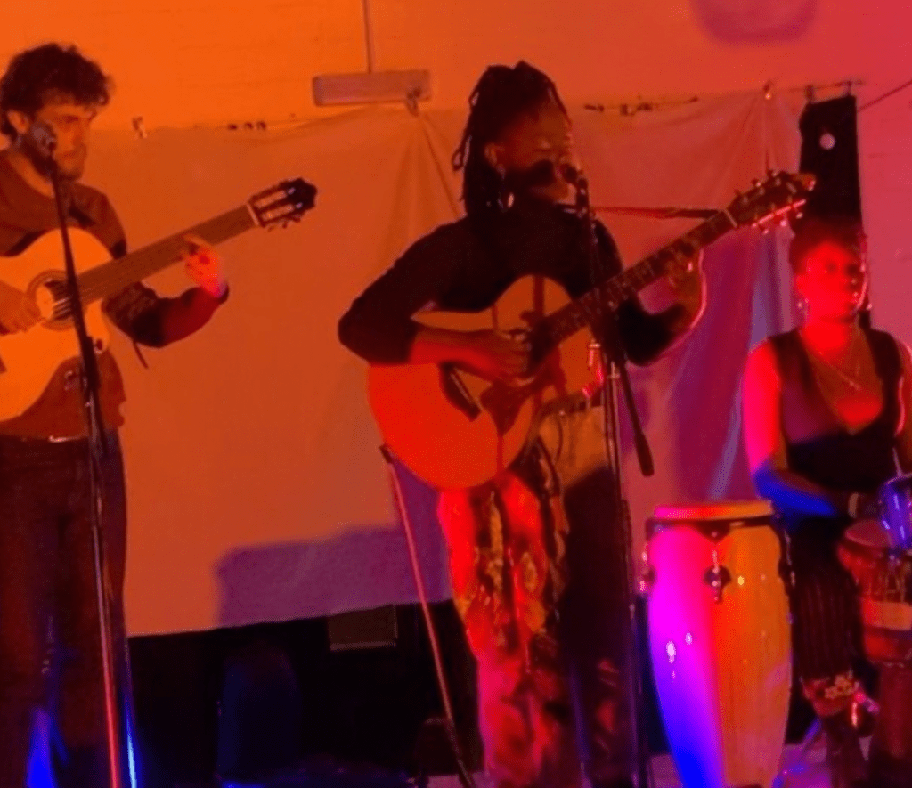 The first Contemporary Music Prom took place on 15th May 2022. No-one could have predicted the events we would be up against on the day. Firstly, despite weather forecasts of sunshine and decent Spring temperatures, it rained all day and, despite the roof-covered courtyard offering shelter even in the open air part of the venue, it put a lot of people off. Despite this the day began with a big crowd watching inspiring performances from a number of bands brought along by Habersashers Hatcham College with students aged 12 – 18 performing in the afternoon’s opening slot. But then one of the food vendors had to rush to hospital when his assistant fell and injured herself and the other simply failed to show. Faced with a hungry audience who were leaving in their droves, emergency action had to be taken to buy in a load of supplies and organise volunteers to help sell food to those who stayed. Thankfully, by early evening, audience numbers had swelled again and those who got to play later in the day had good crowds to play to. But I felt for those who were on in the middle of the day and only had around 40 watching them. Nevertheless everyone stepped up and we had stellar performances from Haberdashers Hatcham College; Soricah; Trishala Sridar; Phil Hollins; Birikiti; Rookery Ensemble; Shayne Dalva; Kamura Obscura and Gabrielle Sey (pictured below).